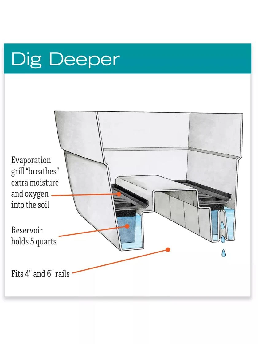 Now itās easier than ever to have lush, colorful plants along a deck railing. This cleverly designed planter securely straddles rails made from both 4″ and 6″ milled lumber (actual width 3-1/2″ and 5-1/2″) ā no mounting hardware needed. Best of all, itās self-watering; simply fill the reservoir and plants receive water as they need it.